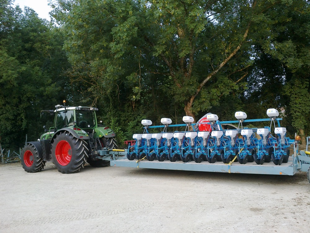 Tracteur Fendt 722 avec semoir monosem NG+4, 12 rangs sur remorque pose à terre